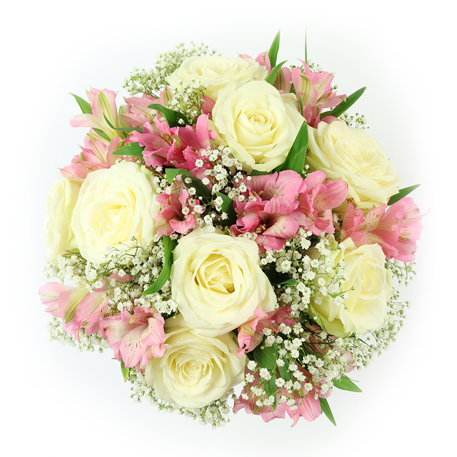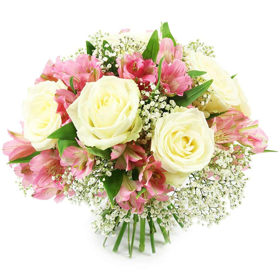 This marvellous hand-tied bouquet made up of white roses, pink alstroemeria, gypsophila, and greenery - the softest and stylish bouquet suitable for any occasion!