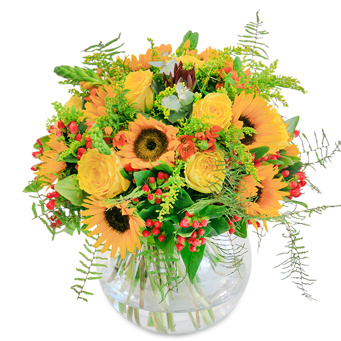 Just a simple look of this joyful combination of bright colours will bring anyone a good mood. There is no inappropriate time to make someone happy with a rich bunch of beautiful flowers including sunflowers, yellow roses, red hypericum, orange hypericum, yellow limonium, eucalypt and aspidistra leaves.